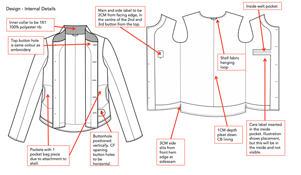 Front and back views should be standard in every flat sketch. It’s also worth including additional sketches to show the inside and functional elements of the garment. Providing multiple views and accessory details helps the factory understand the intended design and construction.